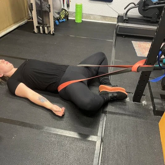 If you don’t have a large loop band, you can skip this step and perform a child’s pose for 1 minute to relax the back. To relax the low back, we can attach a large loop band to a sturdy surface. Set the band up so it is pulling down on the hips. Once the band is in place, lay down and relax. Breath slowly with about a 4 count in and a 4 count out. This will allow the body to relax and feel like it is creating space in the back. Hold for about a minute.