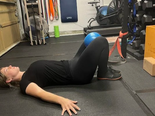 Now to activate some muscles: first up is the Ball Squeeze. Lay down on the floor with knees bent and feet about a fist distance apart on the floor. Place a ball or rolled up towel between the knees. Squeeze the ball with knees for 5 seconds as hard as you can. Relax, and perform 5 more times. Some people may experience a popping sensation in their pelvis during this movement. This is normal and is like a knuckle cracking; fluid is just moving to a joint.
